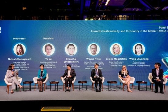 随后,两场专题讨论先后举行。“专题讨论1:纺织全球供应链的可持续与循环之路”汇聚了上海合源环境科技有限公司总经理亚蕾,泰国纺织研究院执行董事Chanchai Sirikasesemler,Fiborge Company Limited董事Wayne Kwok,Komar Brands生产与采购高级副总裁Yelena Mogelefsk,天津工业大学教授、博士生导师王春红五位嘉宾,围绕各国法律法规对可持续发展的相关规定、在供应链各环节如何合作实现绿色发展等问题展开讨论,从政府、生产商、采购商、院校等角度,交流各自看法和经验,他们一致认为,产业的可持续需要通过供应链各环节的通力合作得以实现。该环节由United Textile Mills Co.Ltd执行董事、泰国纺织⼯业联合会国际事务秘书⻓Nutra Uttamapinant主持。