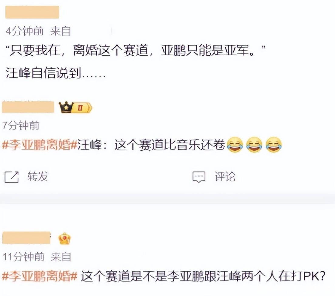 更离谱的是,有网友跑到李亚鹏的评论区,模仿汪峰的口吻留言:“只要我在,离婚这个赛道,亚鹏你永远是亚军。”